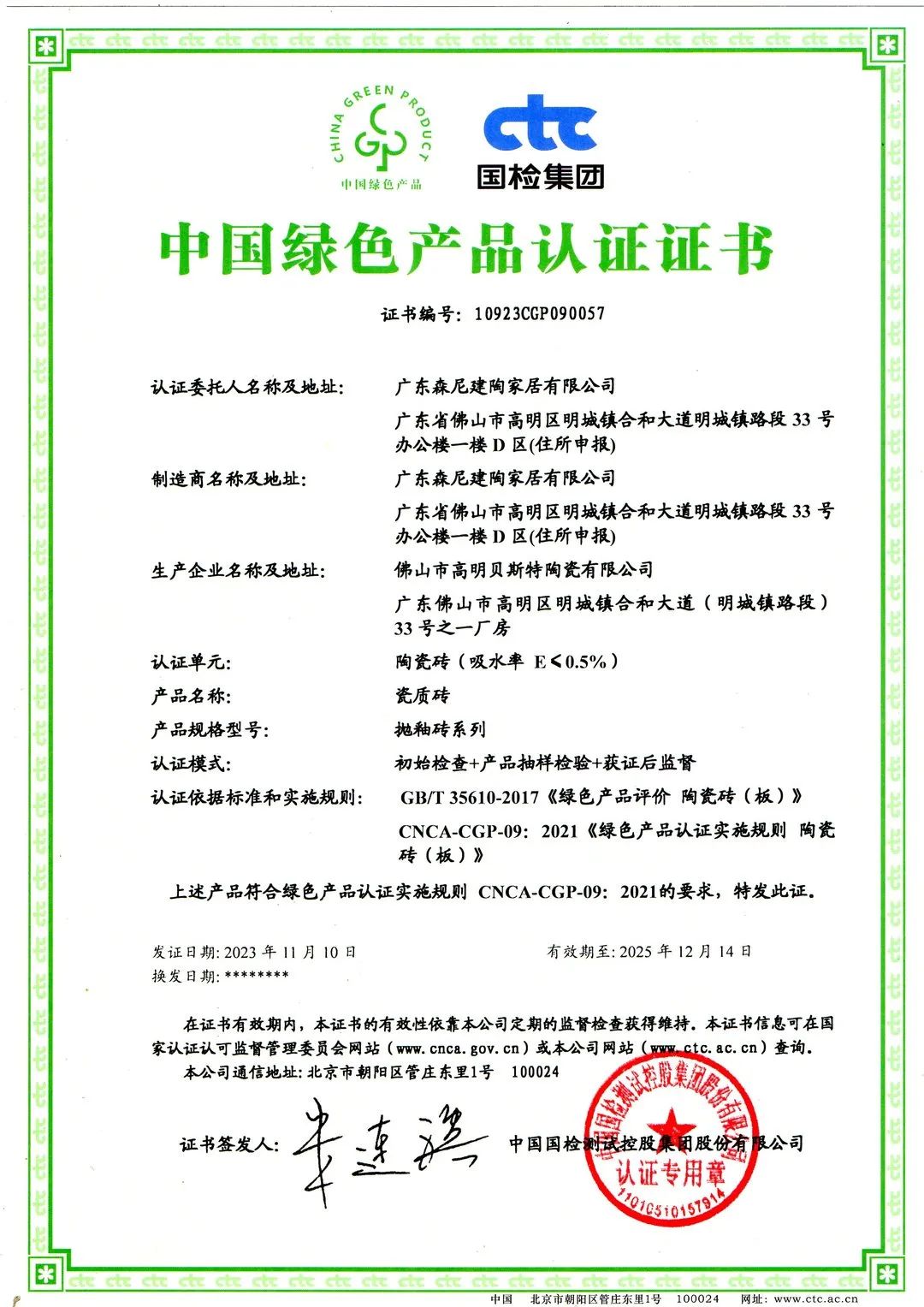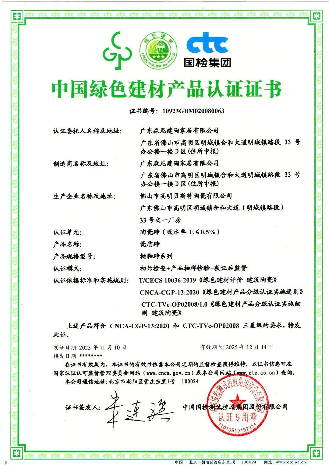 森尼陶瓷板產(chǎn)品符合綠色產(chǎn)品認(rèn)證實(shí)施規(guī)則 CNCA-CGP-09:2021的要求;森尼瓷質(zhì)磚產(chǎn)品符合CNCA-CGP-13:2020 和 CTC-TVe-OP02008 三星級(jí)的要求。