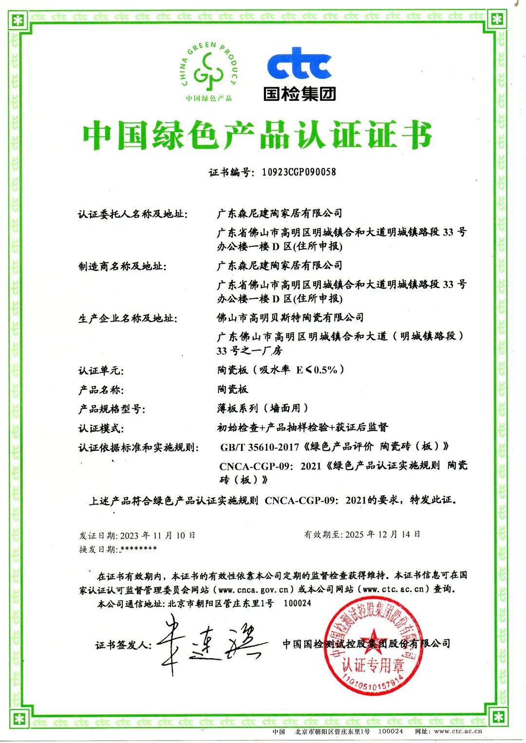 (森尼陶瓷板-綠色產(chǎn)品&綠色建材證書)