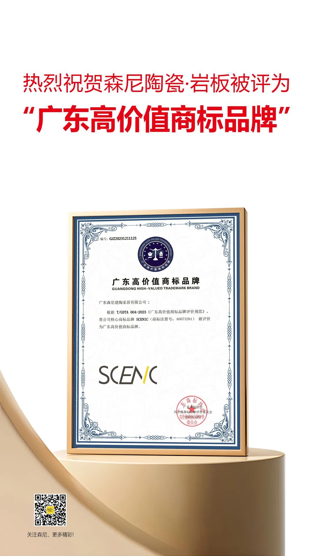 近日,“廣東高價(jià)值商標(biāo)品牌發(fā)展論壇暨成果發(fā)布會(huì)”在廣州成功舉辦。在本次的廣東省重點(diǎn)行業(yè)(陶瓷)高價(jià)值商標(biāo)品牌榜單中,廣東森尼建陶家居有限公司旗下森尼陶瓷·巖板作為佛山本土品牌,憑借其強(qiáng)大的綜合實(shí)力躋身前列。