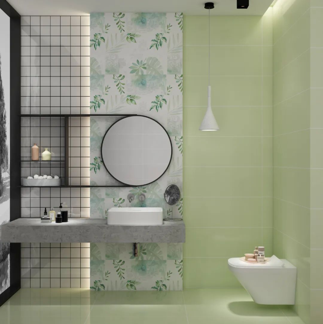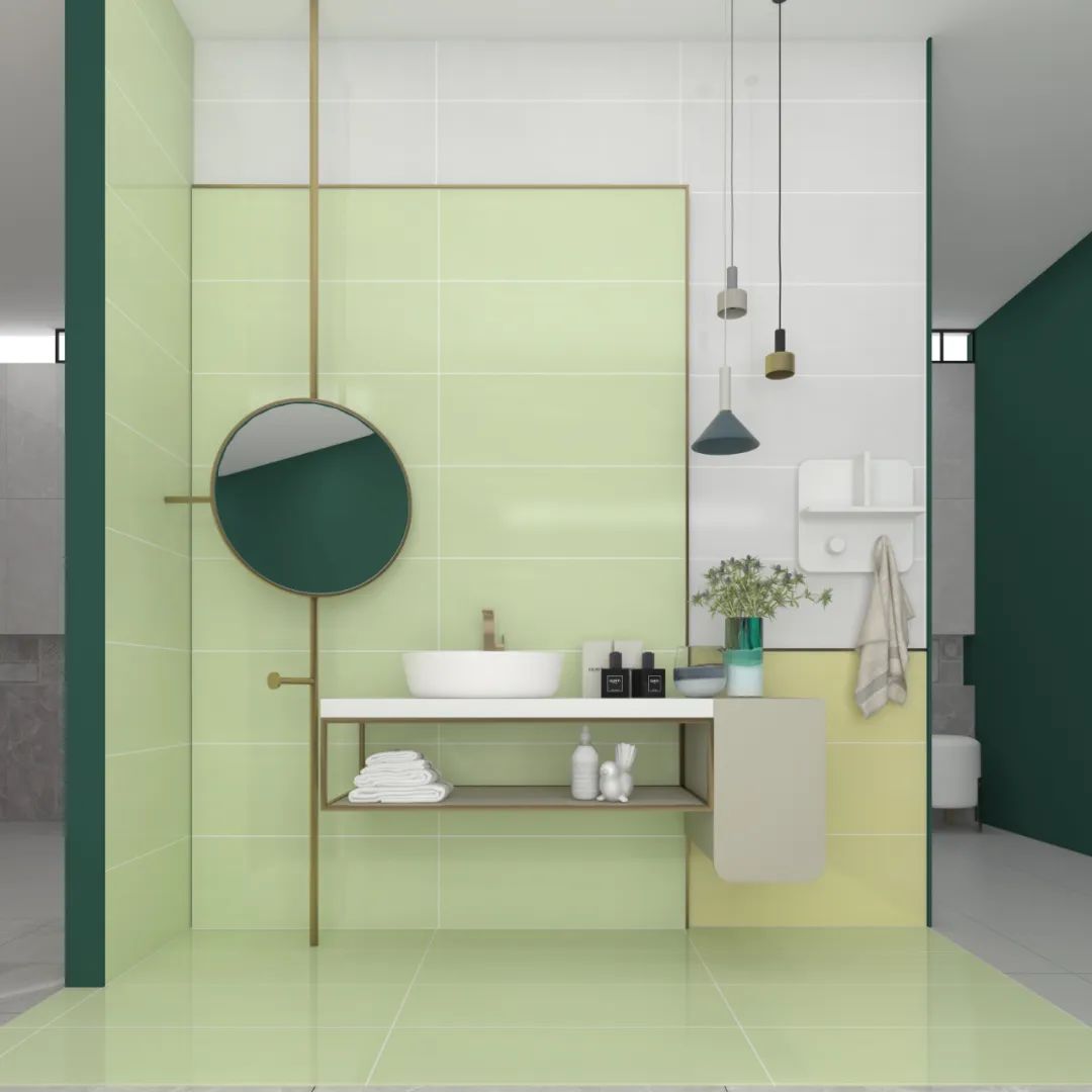 森尼IN·色系列輕奢綠,綠色中的高級(jí)色彩,在空間運(yùn)用中賦予空間輕奢質(zhì)感,同時(shí)它與百變小花磚搭配使用,營(yíng)造出一種輕奢又低調(diào)的空間之感。