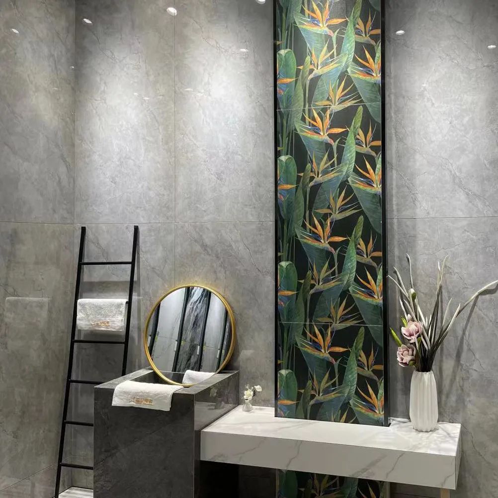 樣板間采用X系列750X1500規(guī)格灰色系產(chǎn)品搭配配套花磚,灰色作為百搭的色彩逐漸成為空間的主打色,在白色仿大理石的臺面與深灰色的洗手盆搭配下,空間顯得更加的時尚,前衛(wèi)。