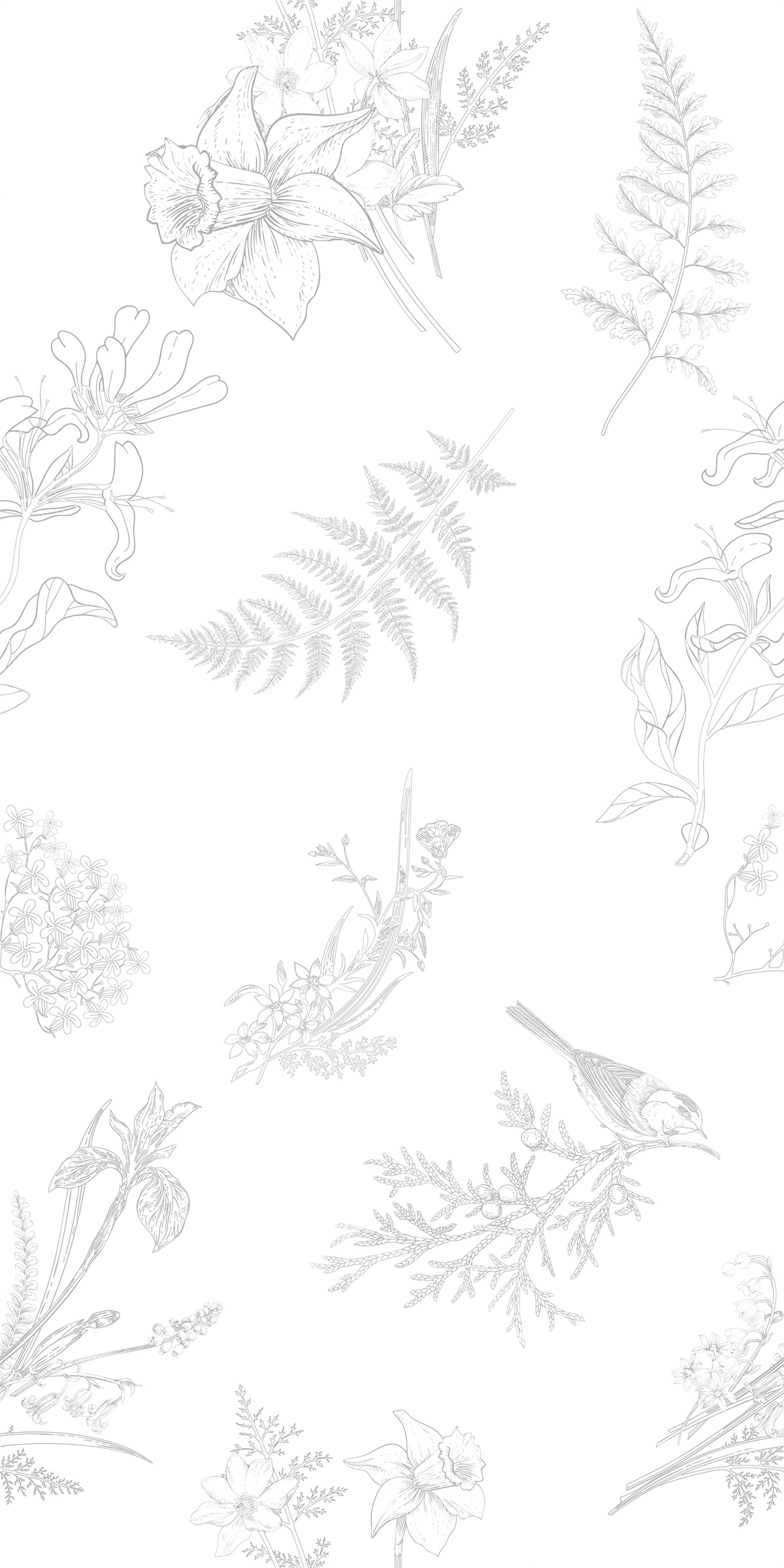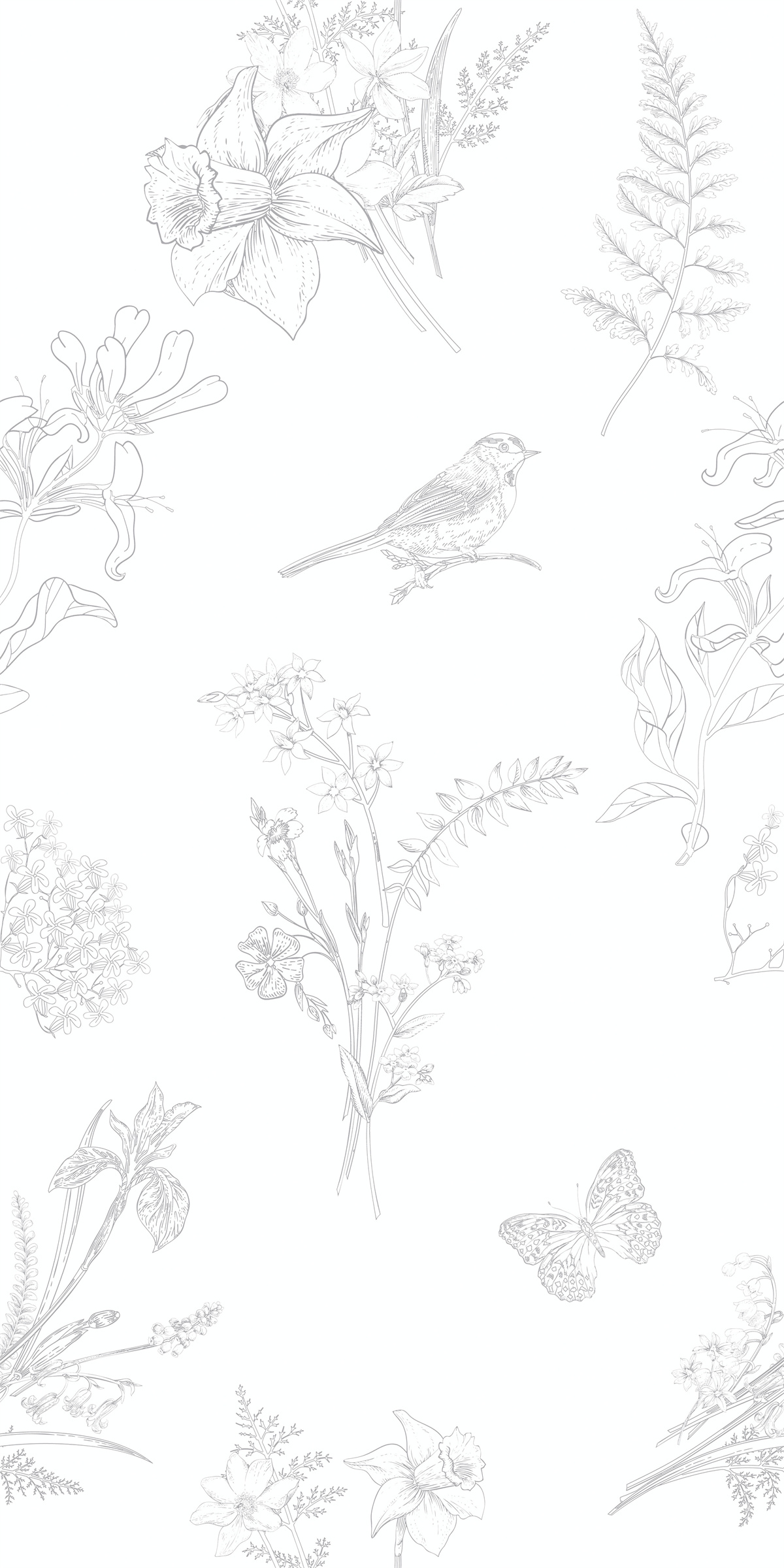 線描呈現(xiàn)小鳥、山茶與蕨葉,元素自然散布,融入莊周夢(mèng)蝶的哲思與奇幻感。
